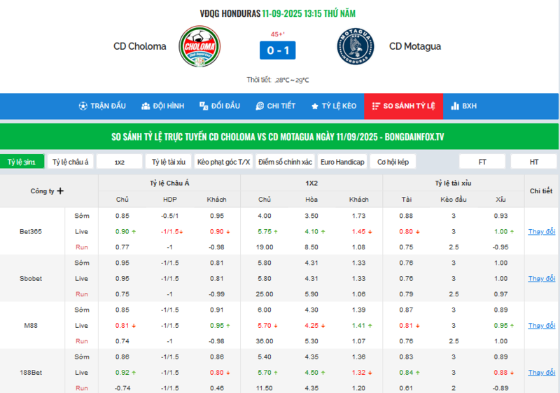 Điểm mình thích nhất là Bongdainfo không chỉ cho xem bảng kèo, mà còn tích hợp luôn tỷ số trực tuyến. Nghĩa là anh em vừa xem diễn biến trận (ai ghi bàn, ai bị thẻ, số cú sút, kiểm soát bóng…) vừa thấy kèo thay đổi theo từng phút.